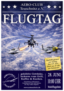« Alle Veranstaltungen Flugtag Aero-Club Teuschnitz e.V. Juni 27 - Juni 28 « Modellflugtage Stappenbach Helitreffen MSG Hassberge » Zum Kalender hinzufügen Google Kalender iCalendar Outlook 365 Outlook Live Details Beginn: Juni 27 Ende: Juni 28 Veranstaltungskategorien: Flugtag, Freundschaftsfliegen, Tradition